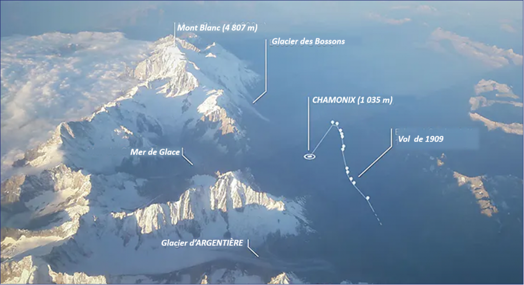 L’objectif de ce vol est de coiffer le sommet du mont Blanc, mais les vents en décident autrement et les aventuriers sont emportés vers l’Est, en passant devant la mer de Glace et le glacier d’Argentières.