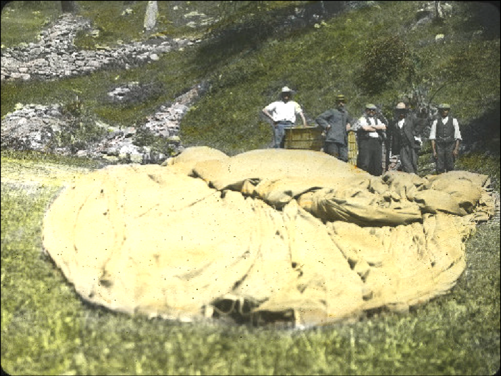 Le jeudi 8 août 1909, le ballon, le ‘Sirius’, s’envole de Chamonix-Mont-Blanc (74/Haute-Savoie) vers 12h 30 avec, à son bord, Eduard Schweitzer, dit « Spelterini« (le pilote), et trois passagers : le Comte de Chateaubriand, Otto Dunker et Frantz Reichel.