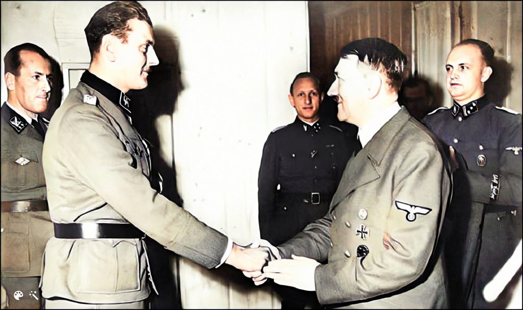 Pour sa part, Skorzeny reçoit la même distinction, mais des mains du Führer en personne.