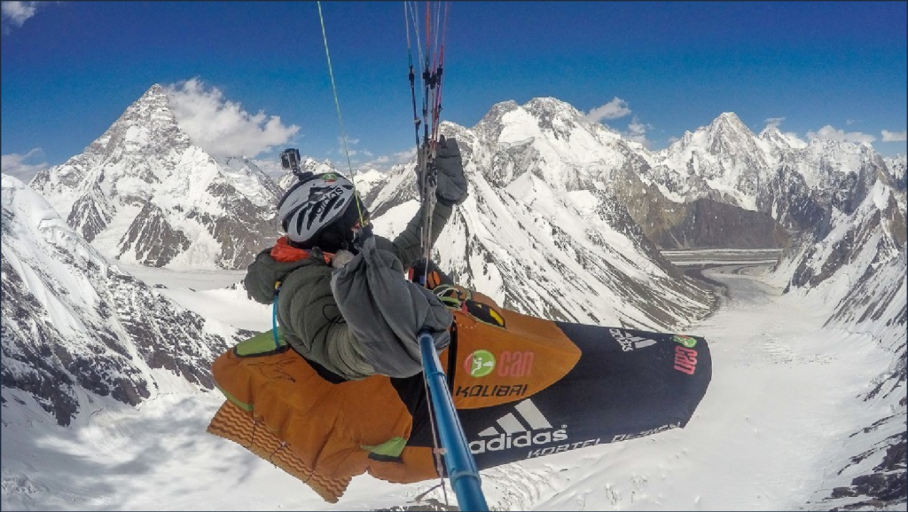 Arrivé au pied des 8 000 de Concordia (zone de confluence des glaciers du Baltoro et Godwin-Austen), le samedi 23 juillet 2016, il décolle à 5 000 m. C’est un endroit impressionnant entouré par plusieurs sommets de 8 000 m d’altitude (y compris le majestueux K2). Il réussit à gravir le Broad Peak (8 047 m) en passant au-dessus des cordées en route par la voie terrestre, survole le sommet et atteint, avec sa voile GIN GTO 2 (et avec bouteille à oxygène) l’altitude de 8 157 m, performance mondiale jamais atteinte d’ascension volontaire en vol par un pilote de parapente. À l’issue de ce vol de sept heures, pendant lesquelles il parcourt 120 kilomètres, il revient se poser à proximité de Skardu.