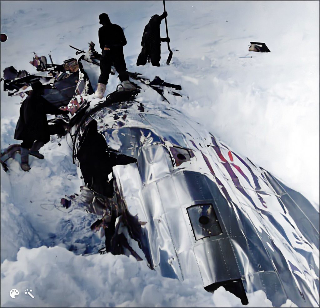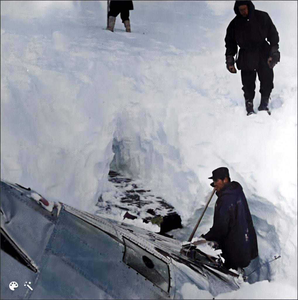 Immédiatement, les hommes déblaient la neige du fuselage. Une section de l’avion est cassée juste au-dessus des toilettes arrière, près de la dérive. La roulette de queue est intacte. À droite de cette dernière, les sauveteurs découvrent les restes du cockpit. La plupart des instruments sont retrouvés, mais ils sont complètement détruits…