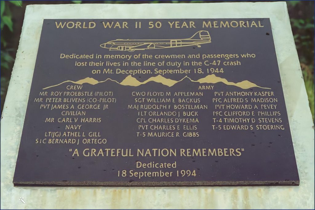 La colonne de secours étant la première à évoluer sur les pentes enneigées d’un pic inconnu, il est décidé, le lundi 13 novembre 1944, de le nommer Mount Deception pour rappeler que les sauveteurs n’ont pas pu mener leur mission à son terme. Il faut se rappeler qu’il existe une montagne du même nom dans les Olympic Mountains (État de Washington)…