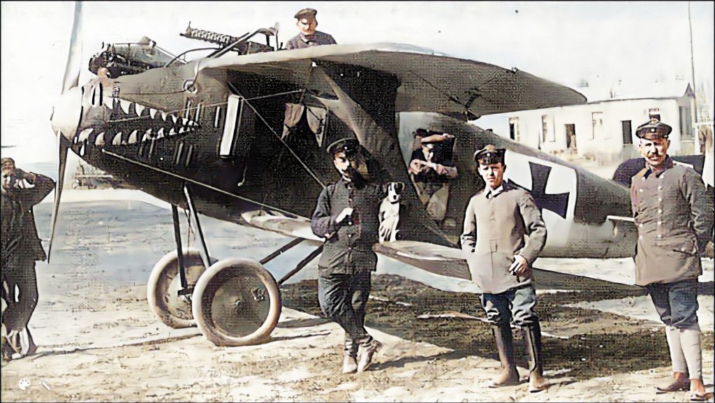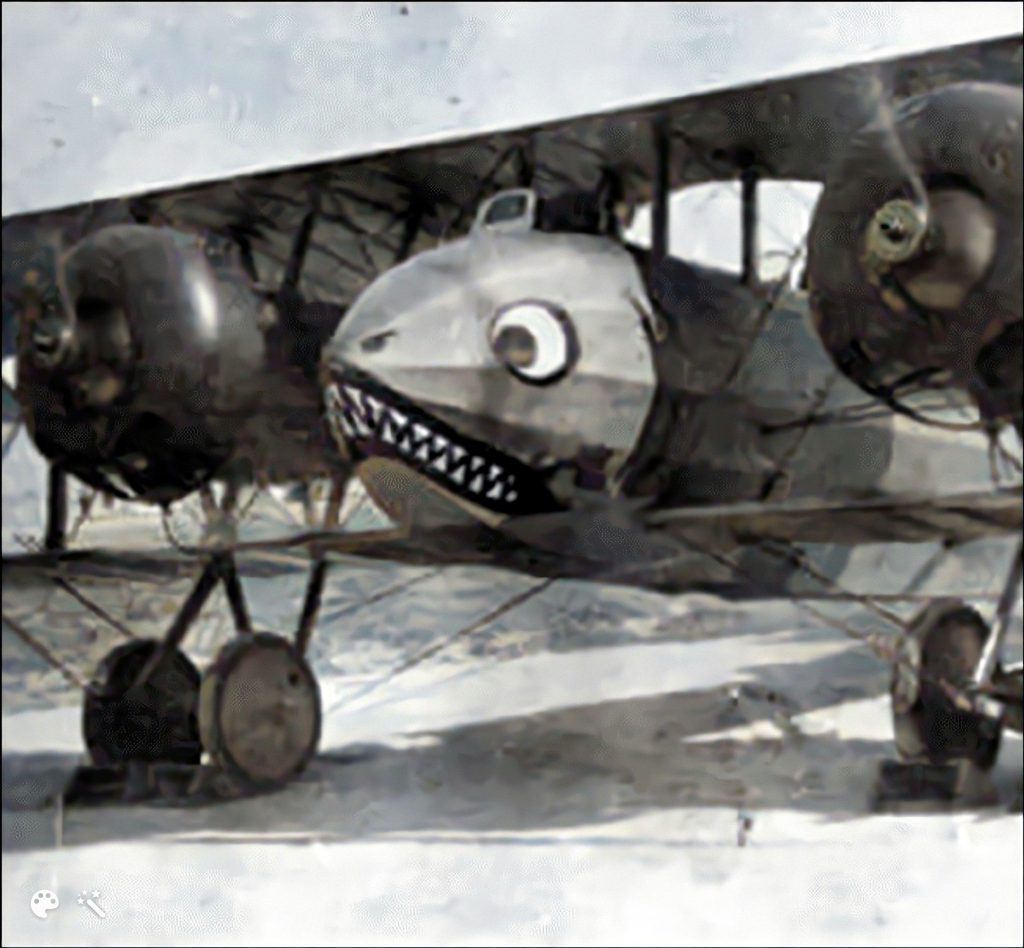 D’autant plus que cette peinture de nez reprend elle-même une mode lancée pendant le premier conflit mondial, lorsqu’il s’agissait de souligner les caractéristiques physiques des avions, dont certains ressemblaient bien à des créatures aquatiques. Il semble bien que les pilotes allemands soient les premiers à avoir adopté des figures menaçantes, généralement des gueules de requins ou de tigres. La première des ‘gueules de requins’ est certainement celle peinte sur le Roland C.IIa, généralement surnommé « la baleine » (« Walfish« en allemand).