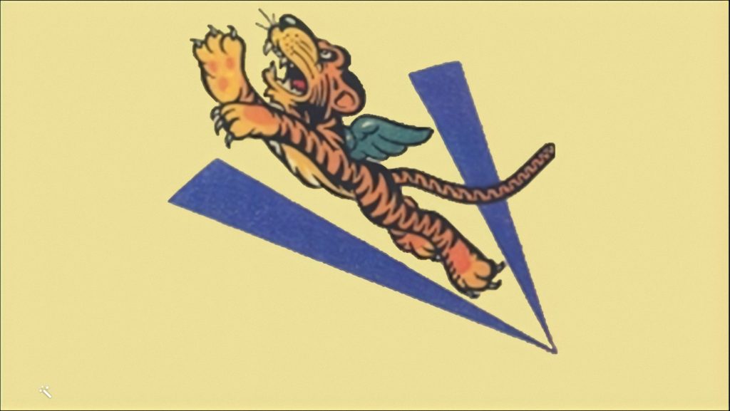 Sans savoir que l’escadrille a déjà adopté comme emblème une tête de requin, Disney part sur un dragon volant censé rappeler la culture chinoise et le combat aérien. Toutefois, ce concept n’est pas retenu car le dragon est synonyme de présage favorable. De plus, la symbolique et la physionomie des dragons sont différentes entre la Chine et le monde occidental. Pour finir, le tigre, bien qu’il soit synonyme de chance dans la culture japonaise, est choisi car il symbolise un animal courageux et féroce. Un employé de Disney dessine un tigre du Bengale avec des ailes, les griffes sorties, surplombant le « V » de la victoire (voir ci-dessous).