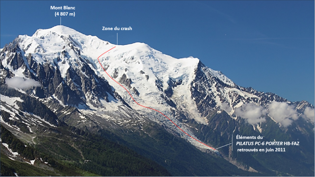 L’histoire aurait pu se terminer là mais, en juin 2001 le gérant du restaurant d’altitude situé au bord du glacier des Bossons, découvre à la base de celui-ci les restes d’un avion.