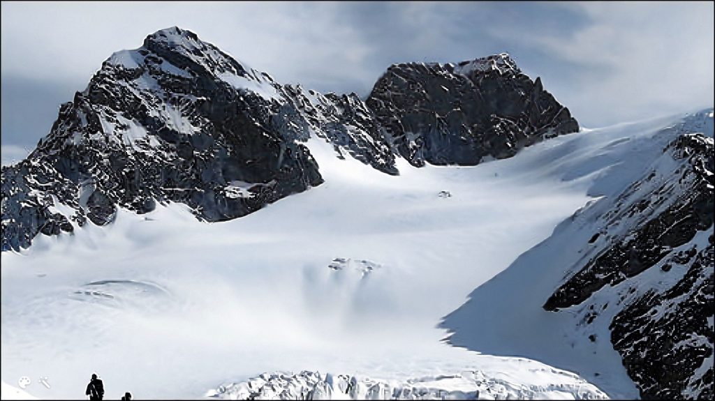 Sortis indemnes du crash sur le glacier, les trois rescapés commettent l’erreur de quitter l’épave de l’appareil. Deux d’entre eux périssent dans une avalanche (référence/photo sublimée, couleurs restaurées).
