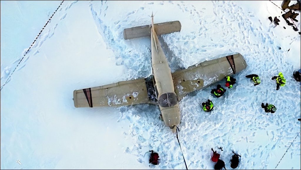 Pendant le vol, l’appareil est victime d’une panne moteur et l’aviatrice aux commandes n’a d’autre choix que d’opérer un atterrissage en montagne. Elle n’hésite pas à s’engager dans l’étroit couloir de neige menant au refuge afin de profiter de la pente ascendante pour ralentir sa course.