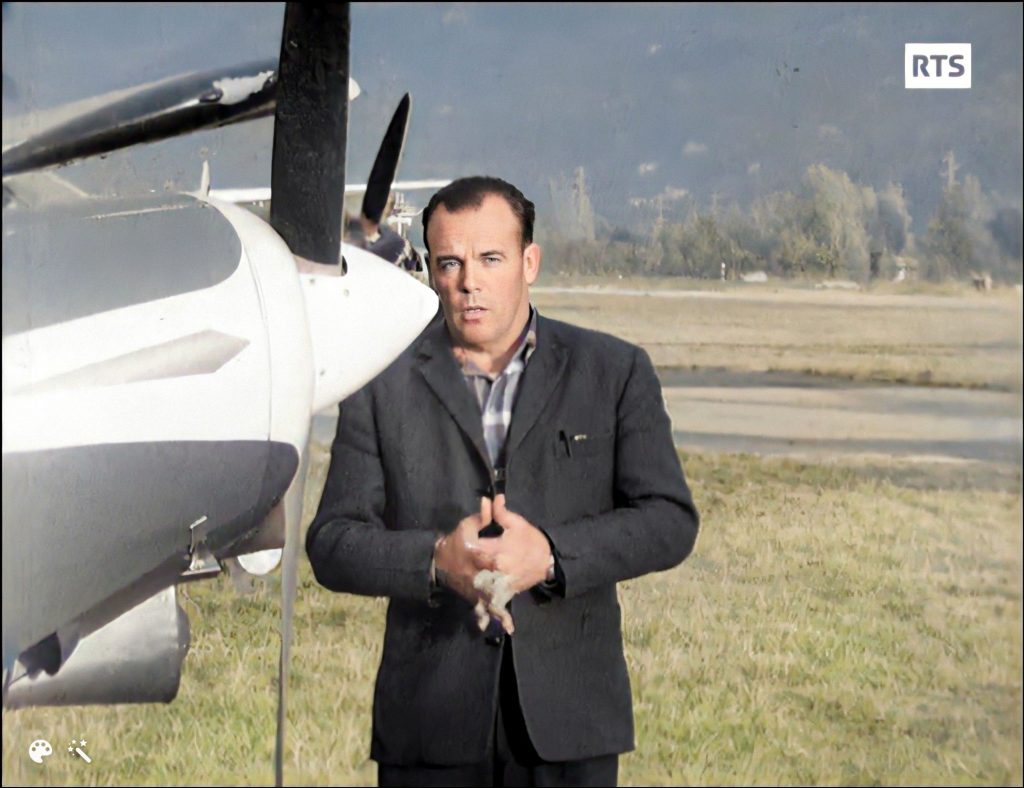 Le 30 octobre 1965, l’émission de la Radio Télévision Suisse (RTS) est introduite par « l’Aigle de Sion », le célèbre « Pilote des Glaciers », Hermann Geiger. Celui-ci cède la parole à l’élève-pilote Gilbert Bécaud qui, aux commandes du Cessna 172E de l’Aéroclub de Genève immatriculé HB-CMO, entonne l’une de ses chansons, T’es venu de loin ?