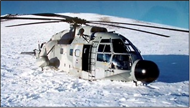 [32/48] 31 décembre 1956 – Tout près de Vincendon et Henry, le « S-58« du commandant Santini et de l’adjudant Blanc percute la neige. Il effectue un tonneau complet puis se couche sur le flanc droit. À bord comme au sol, tout le monde est indemne.