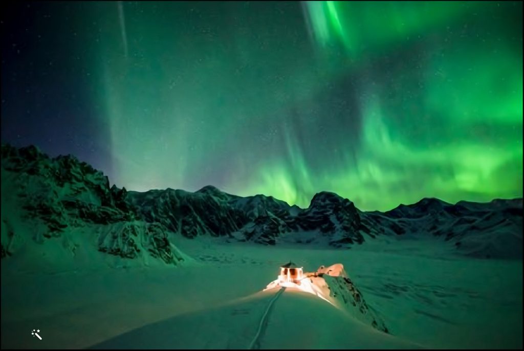 Situé sur le rebord du Don Sheldon Amphitheater, à la limite supérieure du glacier Ruth, à une altitude de 6 000 pieds (1 829 mètres), le chalet sert toujours de point de départ de randonnées plus ou moins longues et, aux moments les plus propices de l’année, d’observatoire pour d’exceptionnels aurores boréales…