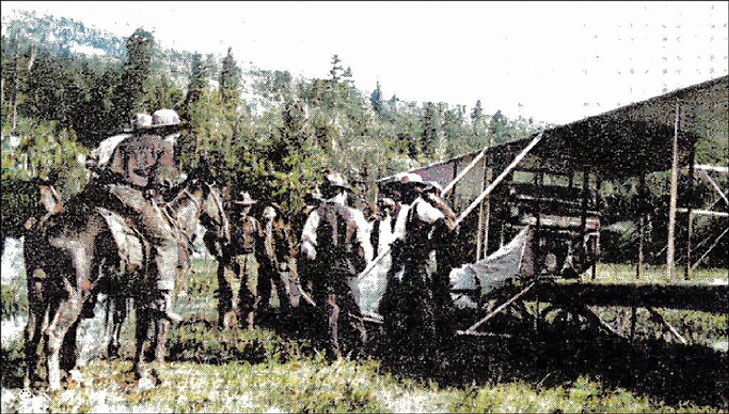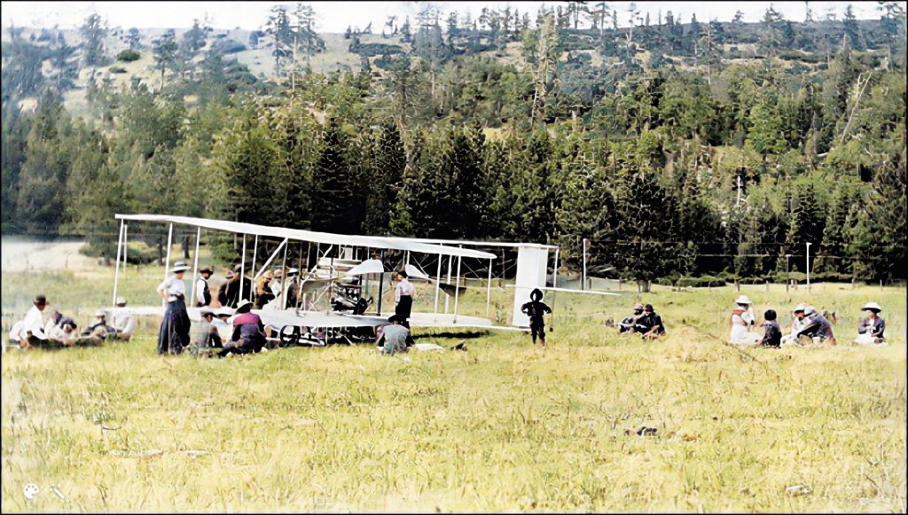 Le dimanche 24 septembre 1911, Fowler décolle à nouveau en direction du col Donner, mais rencontre, ce jour-là, des vents encore plus dangereux que lors de sa tentative précédente. Bien qu’atteignant une altitude de 7 500 pieds (2 286 mètres), il est forcé de faire demi-tour et d’atterrir à Carpenter’s Flat, à Emigrant Gap. Ci-dessous, nous pouvons voir l’avion avec un groupe de personnes appréciant ce qui ressemble à un pique-nique autour de l’appareil. Imaginez à quel point cela a dû être excitant pour ces montagnards d’être les témoins d’un événement historique se déroulant dans un coin aussi reculé…